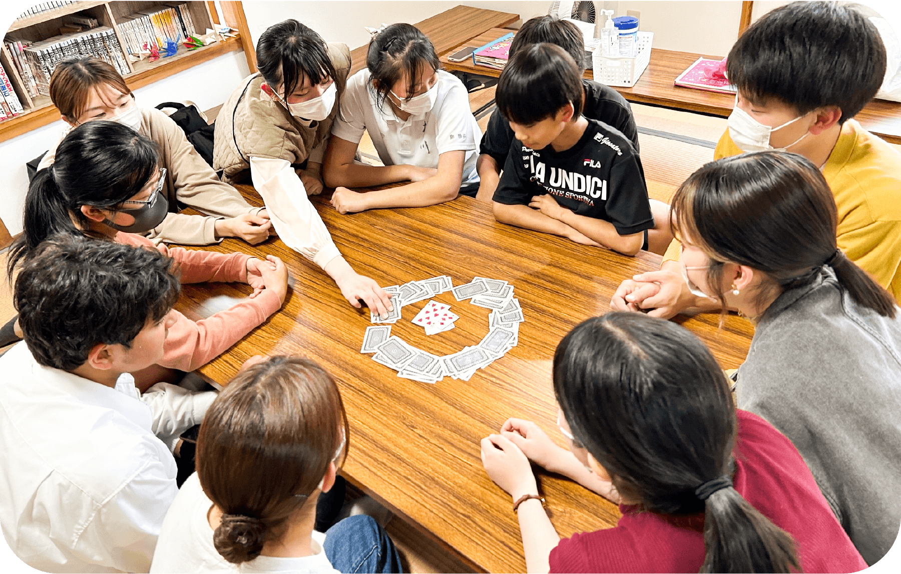 将来教員をめざす学生たちが子どもたちに関わっています。学生たちにとっては、多様な子ども理解、異文化理解が学べる自主的な教育実習の場になっています。